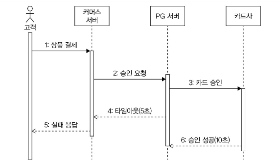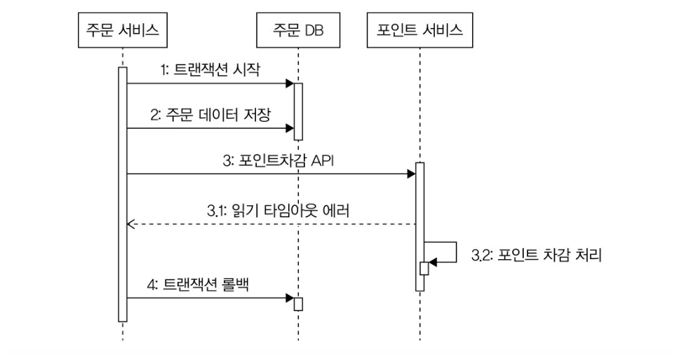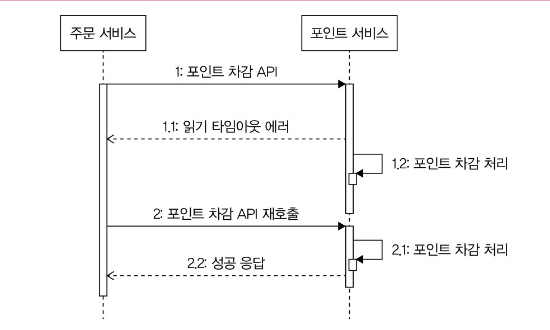 읽기 타임아웃은 재시도할 때 주의해야 한다. 이 경우는 이미 연동 서비스가 요청을 처리하고 있는 중이기 때문이다. 만약 위 사례처럼 재시도를 해서 포인트를 중복 차감하면 데이터 문제가 생길 수 있다.