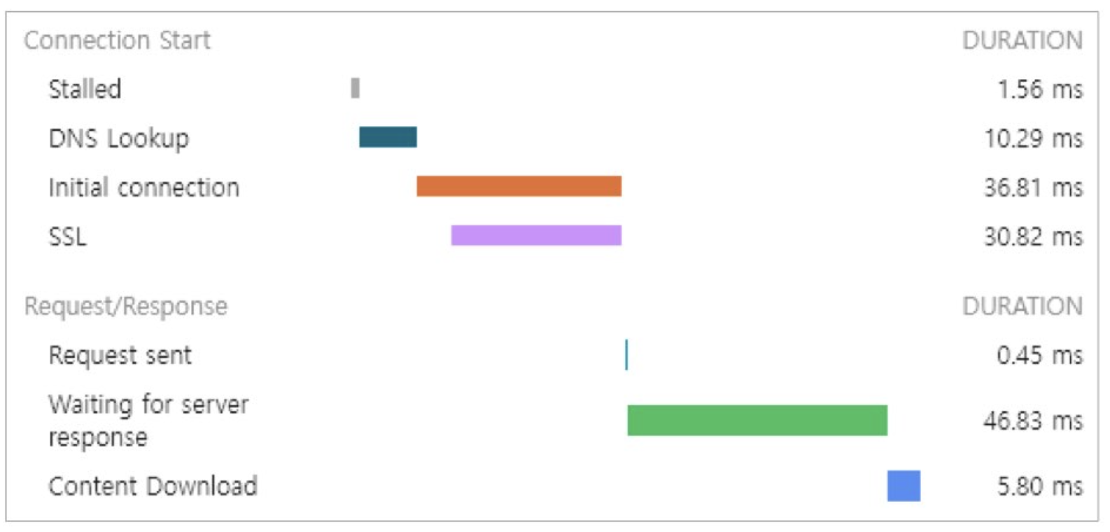요 사진은 크롬 브라우저의 개발자 도구로 인터넷 URL의 처리 시간을 분석한 것이다. 콘텐츠 다운로드에 걸린 전체 시간이 0.1초인데, 서버 연결이 약 0.047초로 약 47%를 차지하고 있다. 이 말은, 전체 처리 시간에서 연결 시간이 차지하는 비중이 크다는 얘기다.
