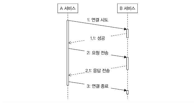 API 연동 통신 과정을 단순화해서 그림처럼 표현하면 연결, 요청, 응답, 종료 4단계를 거친다.