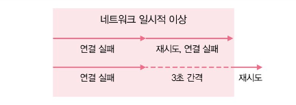 재시도 간격도 중요하다. 네트워크 연결 상태가 6초간 좋지 않은 상황을 가정해보자. 연동 API를 호출했을 때 3초 후 연결 타임아웃이 발생하게 된다. 이때 바로 재시도하면 같은 네트워크 문제로 인해 또 문제가 발생한다. 근데 3초 간격을 두고 재시도 한다? 그러면 문제가 해결될 가능성이 높다.