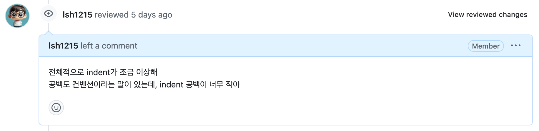이미지를 보면 다음과 같이 indent blank size가 1로 되어있는데, 이 친구가 IDE 설정을 건드렸거나, 다른 곳에 코드를 복사해놨다가 붙여넣으면서 다음과 같이 blank size가 이상하게 지정된 것 같다. 이것 때문에 코드를 알아보기 힘들었고, 나는 이 내용을 공유하면 좋겠다고 생각해서 다음과 같은 review를 남겼다.