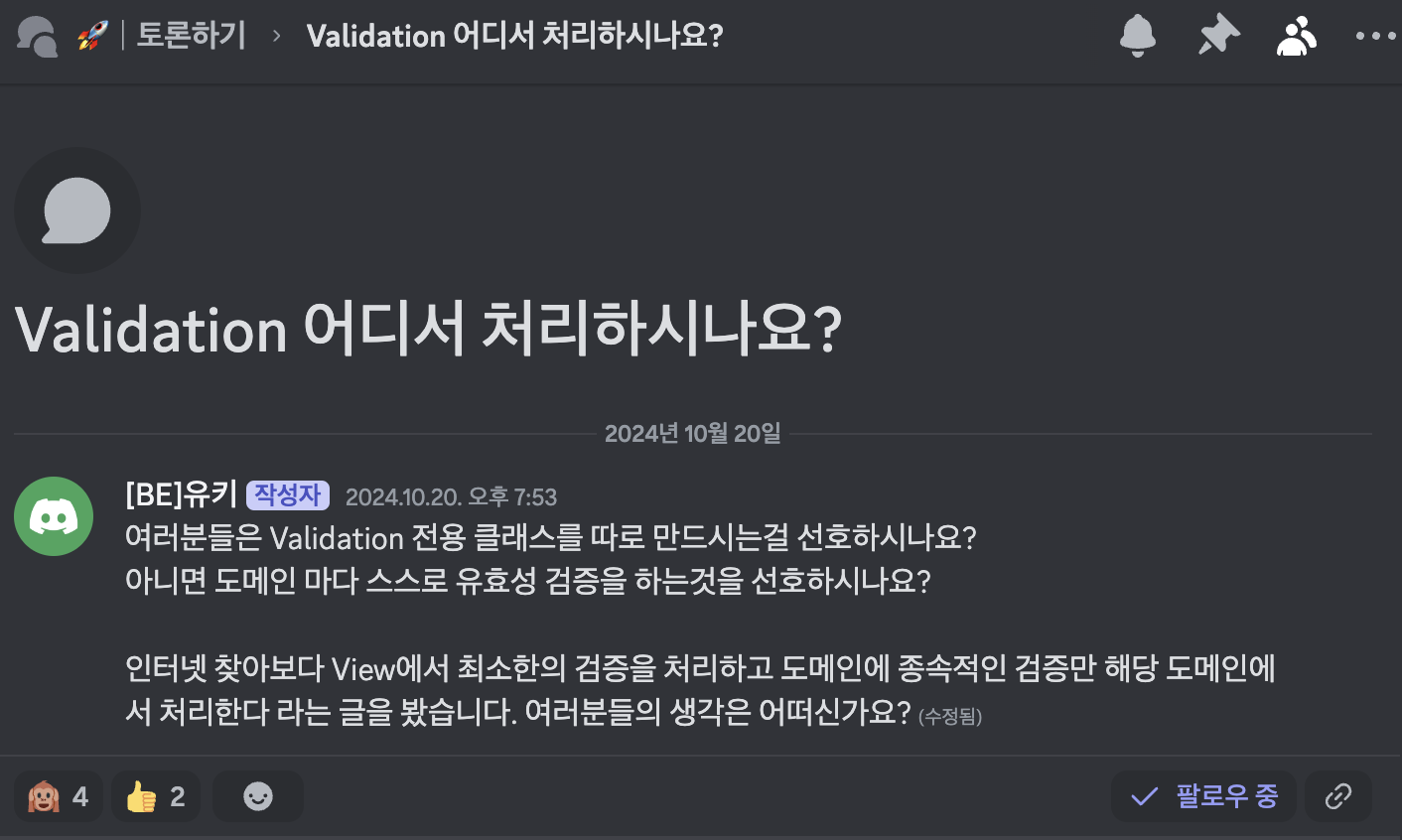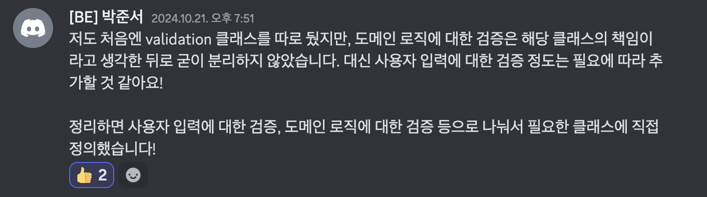 한편, “Validation 처리에 대한 전용 클래스를 따로 만들어야 하는가?”에 대한 토론이 우테코 디스코드에서 이뤄졌다. 나도 그랬지만, 다들 Validation 처리에 대한 고민이 있었던 것 같다.