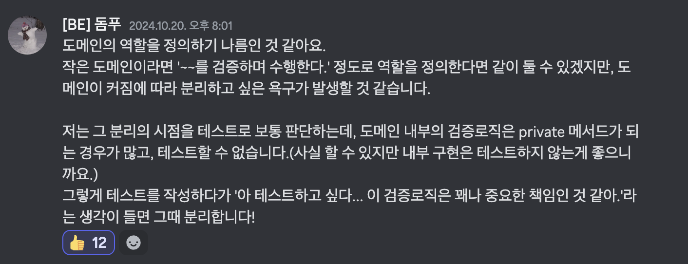 결론적으로, 내가 판단하기에는 도메인의 사이즈와 테스트 코드의 작성 시점으로 판단하는 게 꽤 괜찮은 생각인 것 같다. 또, 도메인 로직과 유효성 검증에 대한 class 책임을 굳이 분류할 필요는 없을 것 같다. 앞으로 더 코드를 작성해보면서 나에게 맞는 방법 혹은 내가 옳다고 생각하는 방법을 확립하는게 중요할 것 같다. 또 fail fast에 대한 내용을 참고해도 좋을 것 같다.