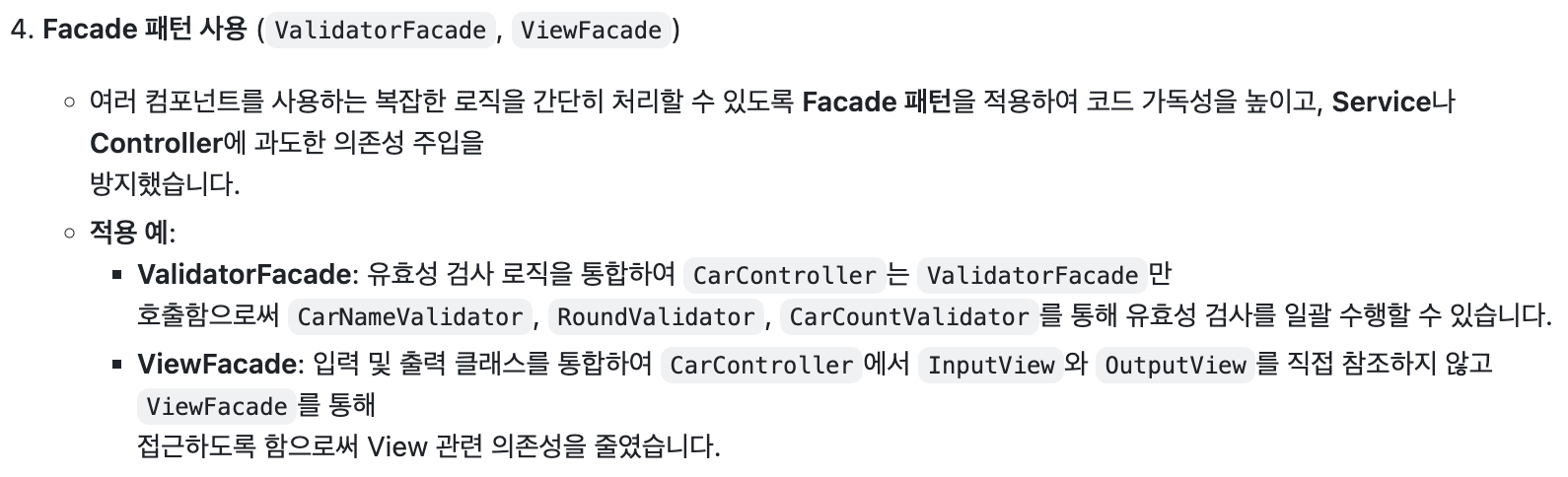 Validator에 정의된 시도 횟수에 대한 유효성 검증을 하는 함수에서 값을 검증하는 것만이 아니라 반환도 하다보니 책임이 명확히 분리되지 않고 책임이 다소 섞인 느낌이 들었다는 것이다. 나도 내가 책임을 명확히 분리하지 못한 코드를 적었다고 생각하고 다음 과제에서는 책임이 명확히 분리된 코드를 작성해야겠다고 생각하게 되었다.